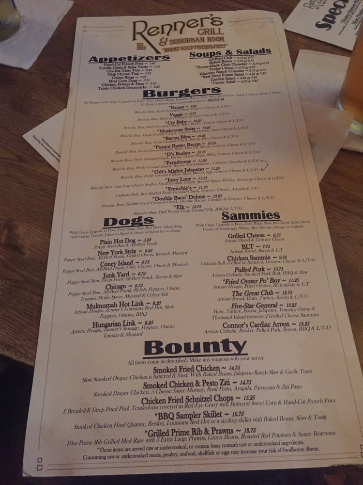Renner’s Grill Menu